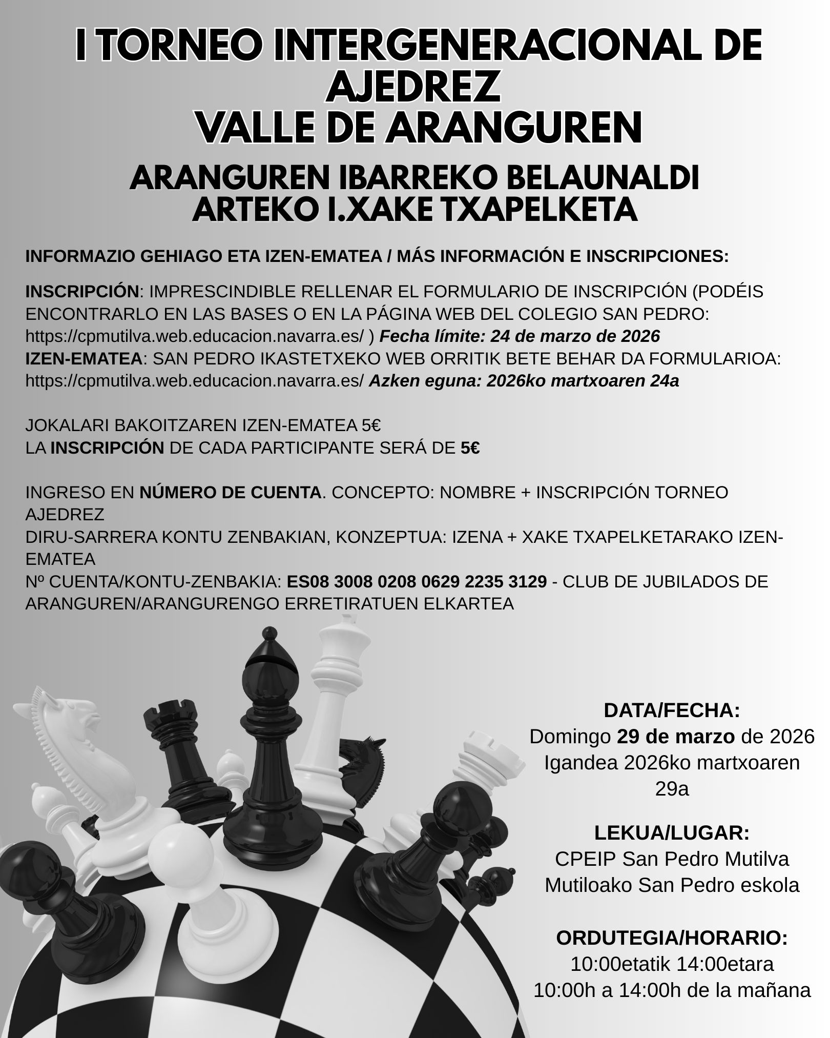 El próximo 29 de marzo de 2026 se celebrará el primer torneo intergeneracional de ajedrez del Valle de Aranguren. Puede ser un momento muy especial para compartir entre mayores y pequeños la pasión por este juego.